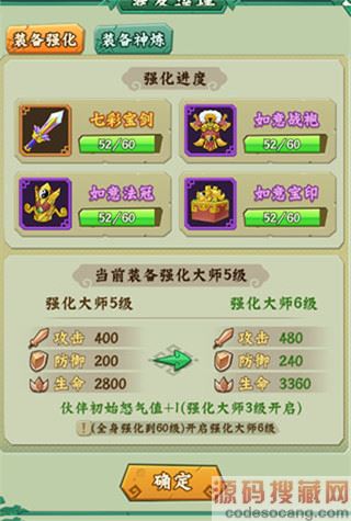 装备可以通过强化来提升装备的属性,强化需要消耗银币,强化的最高等级为游戏角色当前等级的2倍,比如你是20级,最高就能把装备强化到40级,除了强化系统以外,强化还有一个强化大师功能,全身装备每10级可以提升1级强化大师等级,强化大师等级会额外提升属性比如全部装备达到50级,强化大师的等级也就是5级,强化大师可以提升攻击,防御和生命属性,建议对于强化等级进行平均性的提升,这样的收益更大。