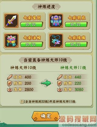 装备还可以通过消耗神炼石来进行神炼提升属性,神炼石分为初级,中级,高级,终极4种类型,金色装备神炼等级达到18级以后每5级会额外增加一次属性(详见上图七彩防具,由于神炼额外等级效果金色防具都是相同的,这里不多作解释),不同部位增加的属性不同,和装备大师一样,游戏也设置有神炼大师的效果,每10级提升1级神炼大师等级,神炼大师可以额外增加攻击,防御和生命三种属性。