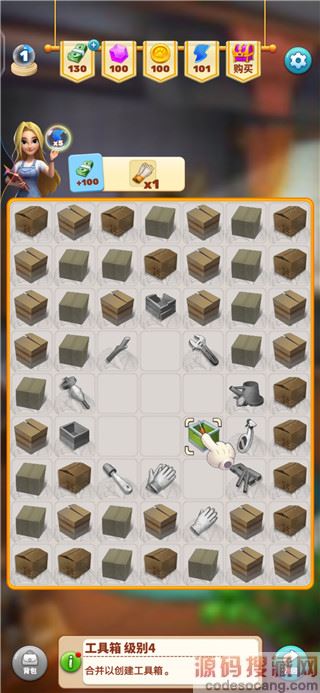 2、当金钱不足时,点击右下角进入消除小游戏。在这里拖动两个相同的工具将它们合并在一起,灰色的是无法直接拖动,只能被动合并,完成上方的工具任务时就可以获得金钱去进行装修。