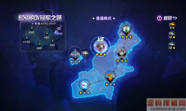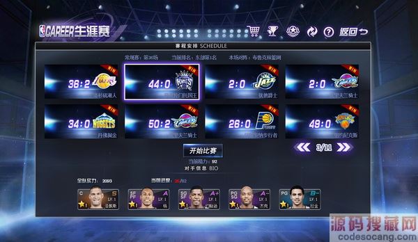 生涯赛根据真实的NBA比赛赛程规则,分常规赛和季后赛的比赛,玩家打完比赛后有即时的东西部排名,82场常规赛结束后东西部前8进入季后赛,达到目标奖励后可领取奖励,生涯赛比赛胜利可获得声望,使用声望可以在声望商店兑换道具