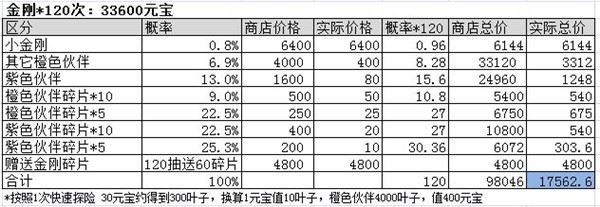 法宝在初期是比较有用的,我做了个表格计算,在灵山寻宝是比在法宝商店买更划算。20000元宝100抽大约能获得价值28000元宝的资源。不过这个1%概率出的整件法宝,我是没抽出过。前期需要法宝时,可以花元宝兑换一些幸运莲花去抽奖。后期我一般不买莲花,因为可以商店用器灵兑换法宝碎片就够了,省一些元宝。