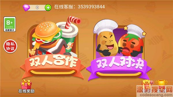 1、下载并安装本站提供的双人厨房做饭最新版,打开进入领取奖励,并选择其中一种模式开始。