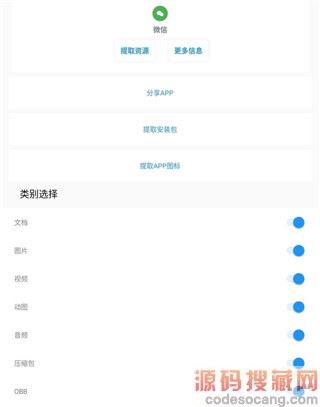 2、以【微信】为例,可以清楚地看到,提取资源、更多信息、提取安装包、获取APP图标以及类别选择对应的选择功能。如果你觉得某个APP的图标很好看,当然可以提取一下,自己所用。