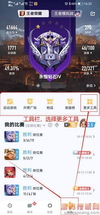 2、将底部导航栏切换到“战绩”页面中,可以看到“战绩”页面中有一个工具栏。