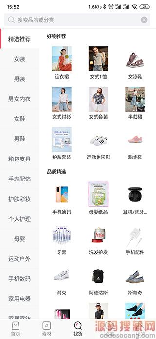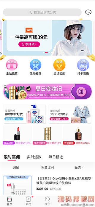 2、然后你会看到5个板块分别为首页、素材,找货、收收益、我的,点开首页这里有大量的商品供用户选择及分享: