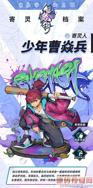少年曹焱兵登场于漫画第67话,在去雪国的途中,为保护曹焱兵,典韦、许褚等守护灵中了冰封谷的封印被冻结。使曹焱兵回忆起了少年时与守护灵于禁的过往历史。少年时的曹焱兵在罗刹街与于禁消灭恶灵的时候邂逅了女灵小柔,并认小柔为妹妹,带回家照顾还处于婴孩时期的弟弟曹玄亮。后来由八神斋带领的大批恶灵入侵罗刹街,曹焱兵不敌,导致小柔被恶灵残忍杀害。于禁为拯救危难,以生命献祭解锁了十殿阎罗,放出了封印在其中的其他守护灵,将八神斋彻底秒杀!而在游戏中少年曹焱兵作为一个初始品质为SR的角色在游戏中出现,少年曹焱兵形象整体色调偏紫红色。潮流的带帽夹克、九分裤和滑板鞋完美搭配,再加上硬核实木棒球棍,充分表现出角色少年时不羁的性格。游戏中的少年曹焱兵使用喷漆进行战斗,所以Bro们可以在罗刹街的各个角落频繁欣赏到他的涂鸦作品。不过不能小看他喷漆的威力哦!配合于禁能打出很棒的组合拳呢。
