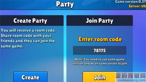 4、点击右侧PARTY进入多人模式,可以创建房间,也可以输入好友的房间代码加入房间;
