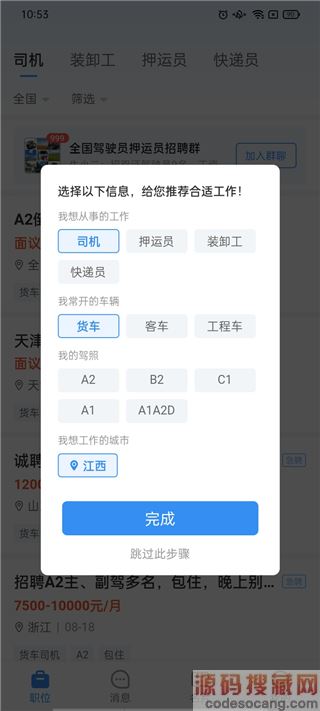 2、选择好你想从事的工作、常开的车辆、驾照、工作城市。