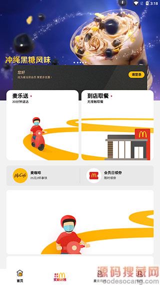 1、进入软件【首页】之后,我们就能看到最常用的两个功能,分别是麦乐送和到店取餐。