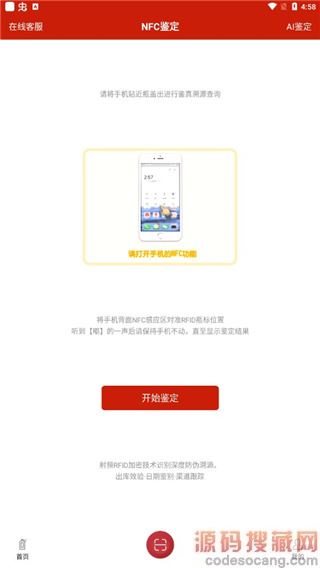 2、然后点击中间的扫一扫按钮,点击开始鉴定,将手机背面NFC感应区对准RFID瓶标位置听到[嘟]的一声后请保持手机不动,直至显示鉴定结果;