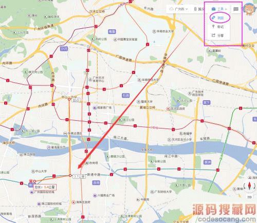 4、打开百度地图网页,点击右上角的工具——测距,就可以在百度地图上通过点与点之间的连接测量两点之间的距离。