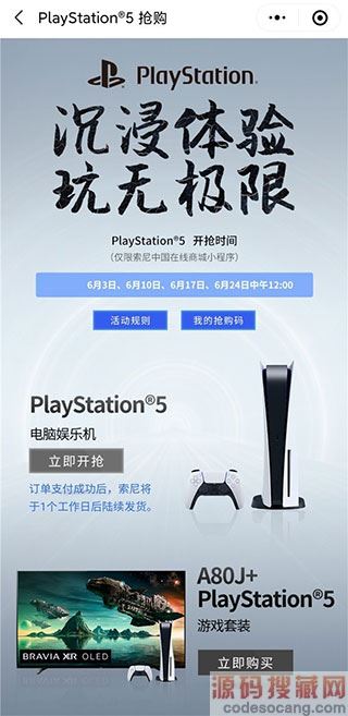 注意:本次活动仅限于My Sony会员,每个会员账号仅限申请一个抢购码,每个抢购码仅限订购一台PS5光驱版。