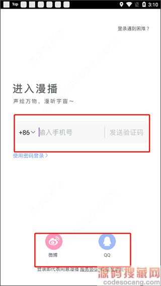 1、首先进行账号登录,支持使用手机号、微博、QQ三种登录方式;
