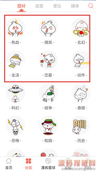 3、点开分类,有热血、高效、玄幻、生活、恋爱等多种题材的漫画;