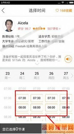 2、进入预约界面,有着外教老师的详情界面,选择预约上课的时间,点击预约课程按钮。