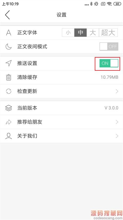 3、在推送设置中关闭即可,同时软件还可以设置很多功能,比如调节正文字体大小、夜间模式等。