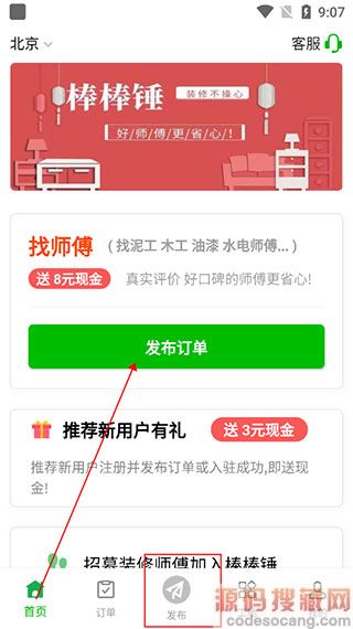 先从本站下载好棒棒锤装修平台app,并且打开应用登录上去,然后在首页会显示“发布订单”或者是找到“发布”,选择需要找的师傅类型等