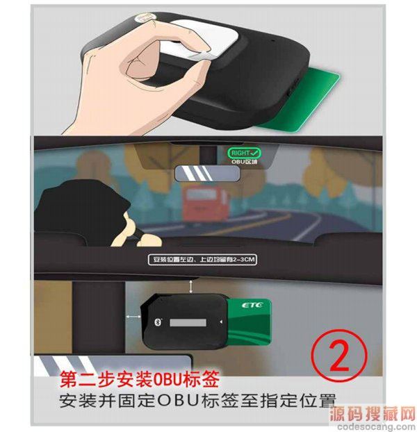 2、安装并固定OBU标签至前挡风玻璃指定位置上;