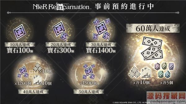官方指出,《NieR Re[in]carnation》事前预约活动即日起正式开跑,官方释出多项预约奖励,包括宝石、高级转蛋券等等,随着预约人数的增加,即可逐步解锁更多奖励。当所有目标达成后,可获得免费的4500 个宝石(相当于15 次转蛋)、3 张高级转蛋券与大量养成素材奖励。