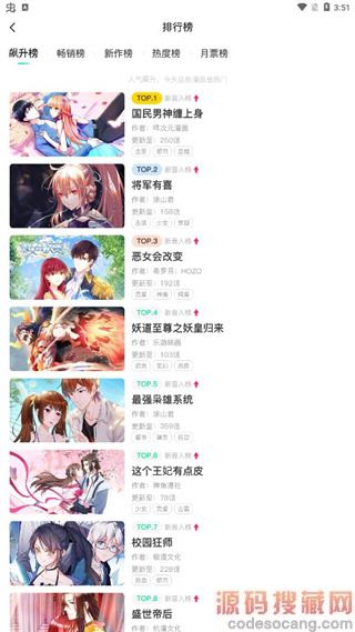 3、点击排行榜,这里有飙升榜、畅销榜、热度榜等多种榜单,当你不知道看什么漫画的时候,可以来这挑挑;