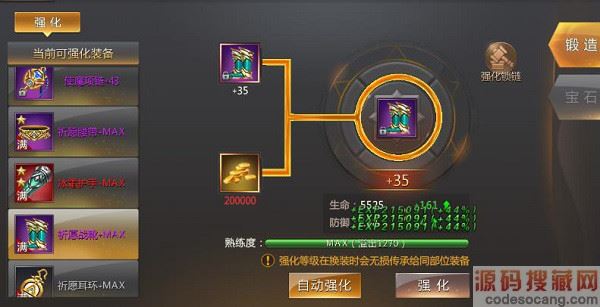 只有已穿戴的装备才能强化,并且强化等在换装时将会无损传承给同部位装备。每强化一次会增加一定的熟练度,当熟练度为MAX时为已满,即强化成功。强化等级上限和当前部位装备的等级、品质、是否是套装装备有关系。强化等级上限=品质加成+套装装备加成。点击右上角的“强化锁链”可查看累计强化加成属性。