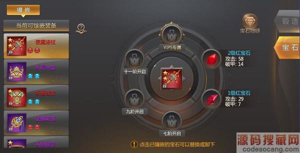 每个装备最多可镶嵌6个宝石,同一装备不可镶嵌相同属性的宝石。宝石镶嵌孔数根据装备除数而定,高阶装备替换低阶装备时,低阶装备自动返回到背包里。点击已镶嵌的宝石可替换或卸下。