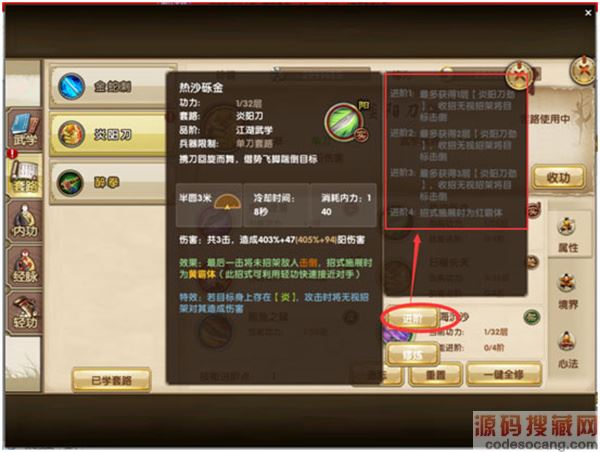 武学中有许多技能是可以进阶的,通过对技能的进阶可以提升该技能的伤害和特效,进阶消耗进阶点数,进阶点数由套路境界提升获得。