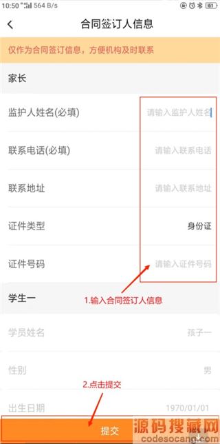 4、输入监护人姓名(必填)、联系电话(必填)、联系地址、选择证件类型、输入证件号码、点击“提交”。