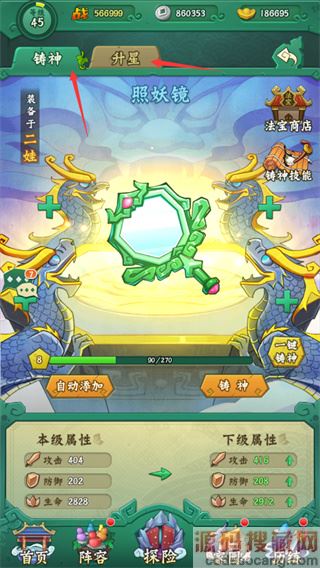 在阵容里,葫芦娃的左边一些的位置,点击装备法宝,法宝还可以铸神和升星。