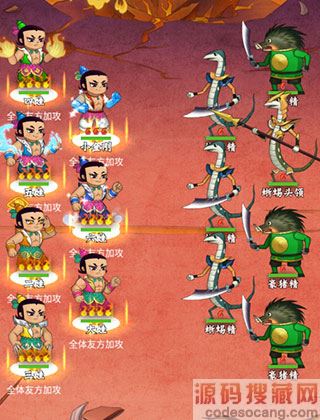 从图中我们可以看到,一共有7只怪物,前排的3只蜥蜴精的仇恨对应的是同排的葫芦娃,后排的4只怪中,第一只野猪精和和蜥蜴统领会攻击前排的第一个葫芦娃,其他两只对应前排另外两个葫芦娃一个一只,所以第一只葫芦娃会被3只怪攻击,其他的都是2只,所以前排第一只葫芦娃一定要能够承受得住,怪物的几轮伤害不被秒,推荐放主坦来这个位置抗。