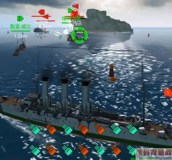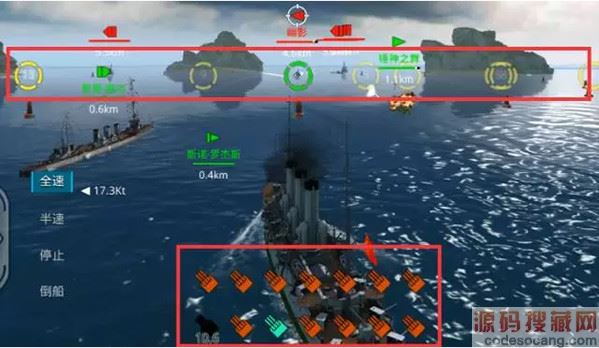 5、那么问题来了,怎么样才能更有效的提高输出呢?其实呢海战中有一种姿势叫做T头,也就是我方战舰用侧舷对着敌方战舰的船头,这样我们就可以同时使船首炮塔与船尾炮塔同时射击。由下图可以看出,转到侧身之后,可以开跑的炮塔明显增多。此时点击屏幕右下方开炮按钮就可以炮轰敌人了。