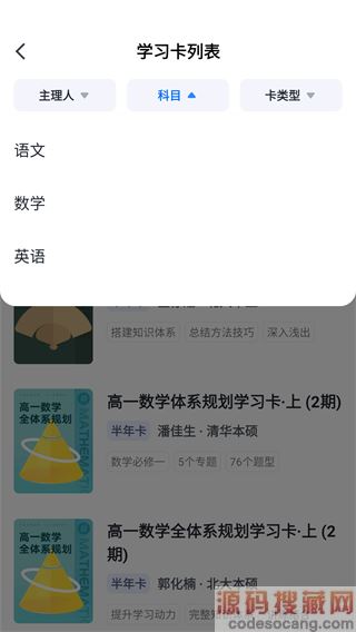 4、在学习卡列表可以选择主理人、科目以及卡类型。