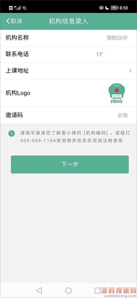 4、接着;在机构信息录入中填写好机构名称、联系电话、上课地址、邀请码后点击下一步;最后就可以等待完成创建了。
