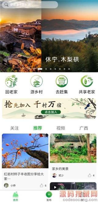 1、我们打开软件同意使用协议后,进入到主页当中就可以看见各种别人分享的农村美景