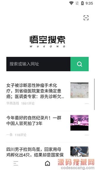 1、下载完成后,打开 App 后,默认为主页,在主页中间为黑绿撞色设计的搜索栏,上方为悟空搜索的中英文标识,下方为推荐的信息流,在右上角还可以进行二维码扫码。当用户开始浏览信息流信息时,app的标识将会淡出,搜索栏也会进一步简化,从而提升用户阅读体验。