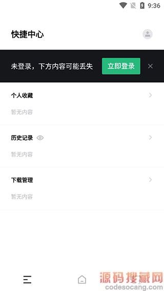 2、app底部为导航栏,除了主页,还拥有左侧的快捷中心和右侧的多窗口功能。在快捷中心内,用户可以看到个人收藏、历史记录和下载内容,同时 App 会提醒用户进行登录。用户点击多窗口后,可以看到当前打开页面,并且可以进行页面添加和删除操作。在该页面右下角,用户可以快捷开启无痕浏览,访问隐私内容。