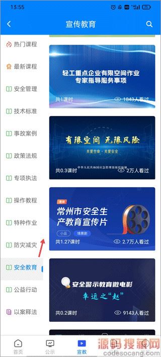 1、打开常州应急官方APP进入首页,切换到“宣教”这个模块,选择左边的安全教育区域,右边有很多的安全教育课程,点击自己喜欢的课程并点进去。