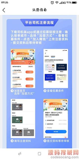 下载司机端APP或通过招募链接注册-确认接单城市-选择“加盟方式”-查看招募条件-点击“加入赚钱”上传资料-提交资料后等待审核