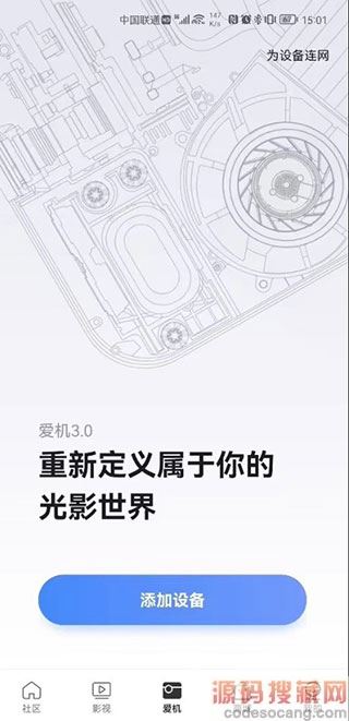 1、确认极米投影仪与手机连接同一个网络,打开手机的极米APP,选择【爱机】,我们得到下图界面。点击中间【添加设备】,点击添加设备进入下一个页面。