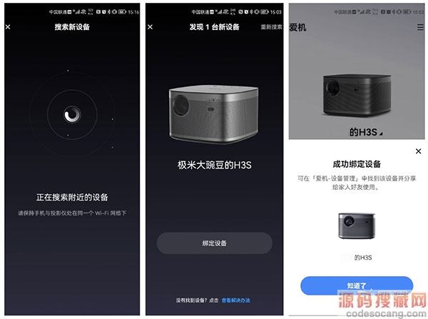 2、进入【添加设备】后画面如下图1所示,等待搜索一般等待5-20秒左右,搜索到设备后,再点击【绑定设备】。接着界面会提示您填写验证码,将极米投影仪画面显示的验证码正确输入,就可以绑定成功。
