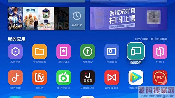 2、二维码和IP地址都在极米投影仪的内置App里,在极米投影仪端首页的导航栏里面选择【我的】,往下拉在【我的应用】里找到【极米投屏】软件并点击打开。