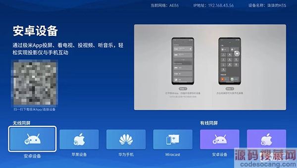 3、打开【极米投屏】后画面如下图所示这样,画面左边显示二维码,选择扫码方式扫码连接即可;IP地址在画面上方,选择IP连接的朋友,输入您机器上方的IP地址即可连接成功。