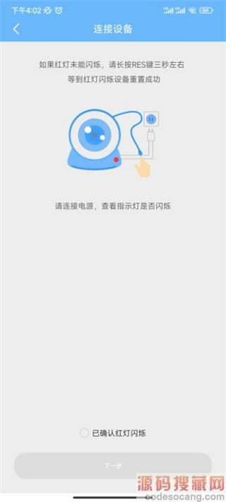 4、连接电源,查看指示灯是否闪烁,当红灯闪烁时,点击下一步;