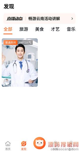 2、切换到【发现】页面之后,我们还能看到各类的直播房间,如旅游、美食、才艺、音乐等。
