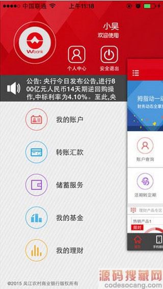 1、登录苏州农商银行app后,向左滑动就可以看到自己的登录的用户名以及个人中心等,用户可以根据自己需求点击查看详情信息