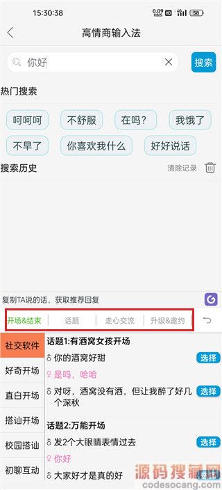 5、如图所示,这就是输入法界面了,可以像常规输入法那样使用,还有各种开场语,话题可以便捷选择
