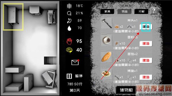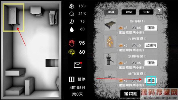 3、然后把火炉建造出来,它可以帮你消耗多余的氧气。家具是有等级的,后续可以将它们升级。