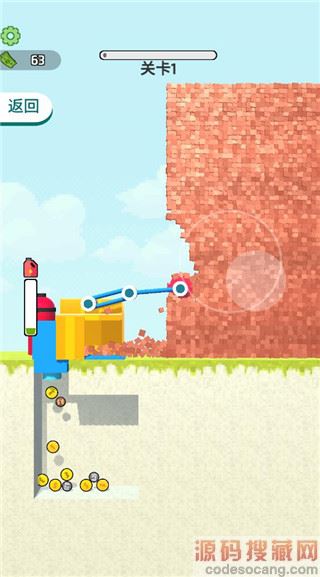 2、进入游戏,用挖机开始挖墙,挖取的数量越多所得的现金就越多