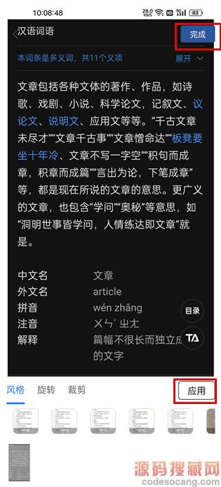 3、可以调整风格、旋转或是裁剪,完成后点击应用,最后点击完成