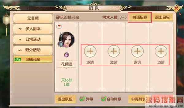 设定好队伍的基本目标,就可以开始招募队友啦~,使用【喊话招募】可以帮助你快速找到队友。当然也可以选择邀请好友或者帮会成员加入队伍。